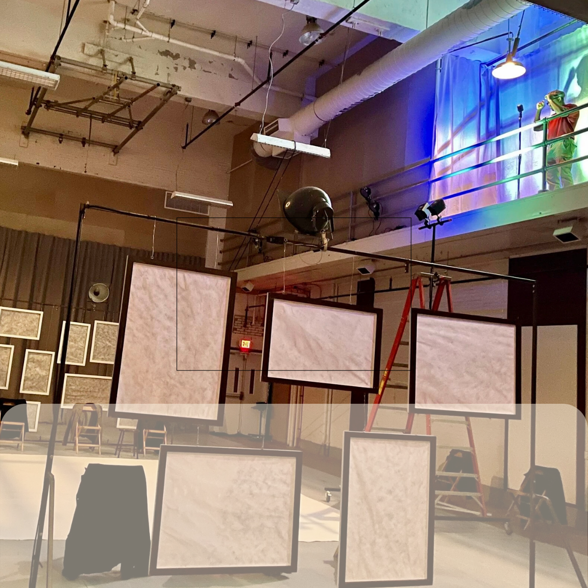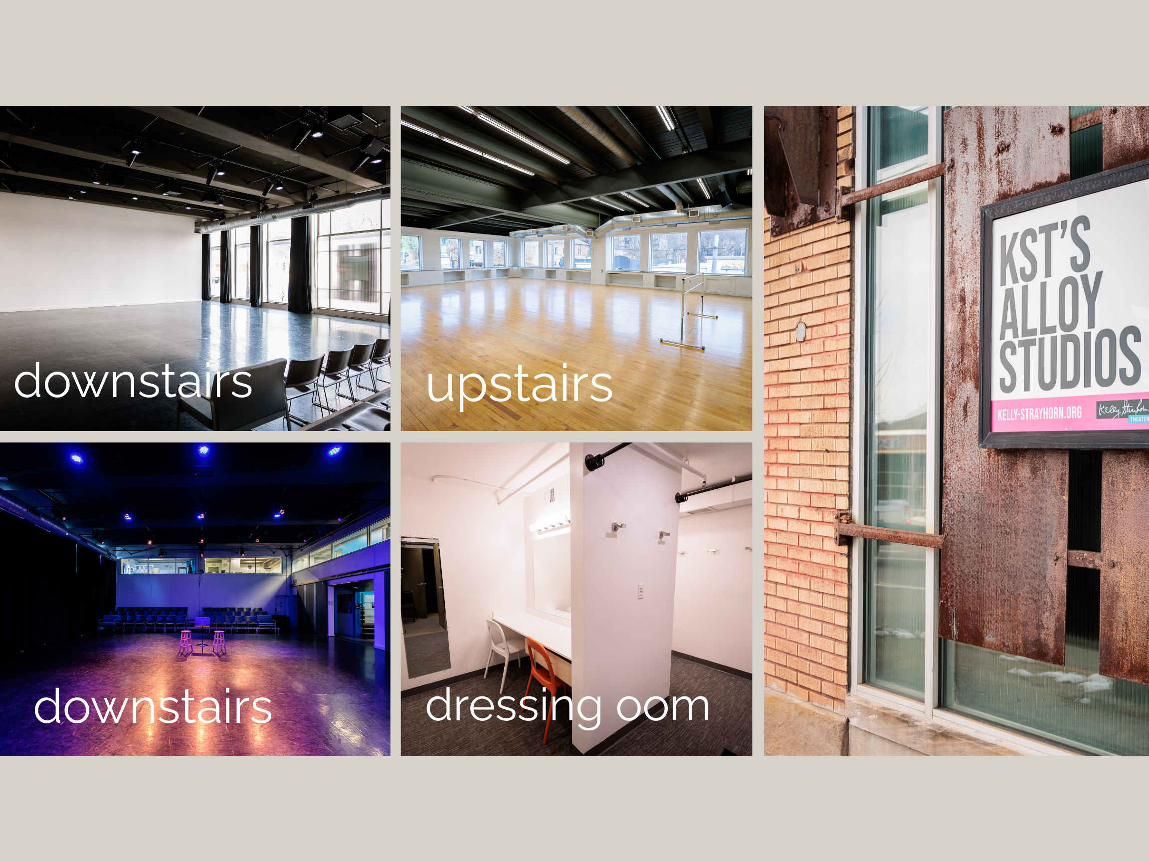 The Downstairs Studio is a two-story black box theater with floor-to-ceiling windows, bluetooth sound, marley flooring, and blackout curtains. The Upstairs Studio is a traditional rehearsal space with a sprung hardwood floor, full-wall mirror, bluetooth sound, and windows along two walls. Both studios are 1650 square feet and have a capacity of 30 for rehearsals.