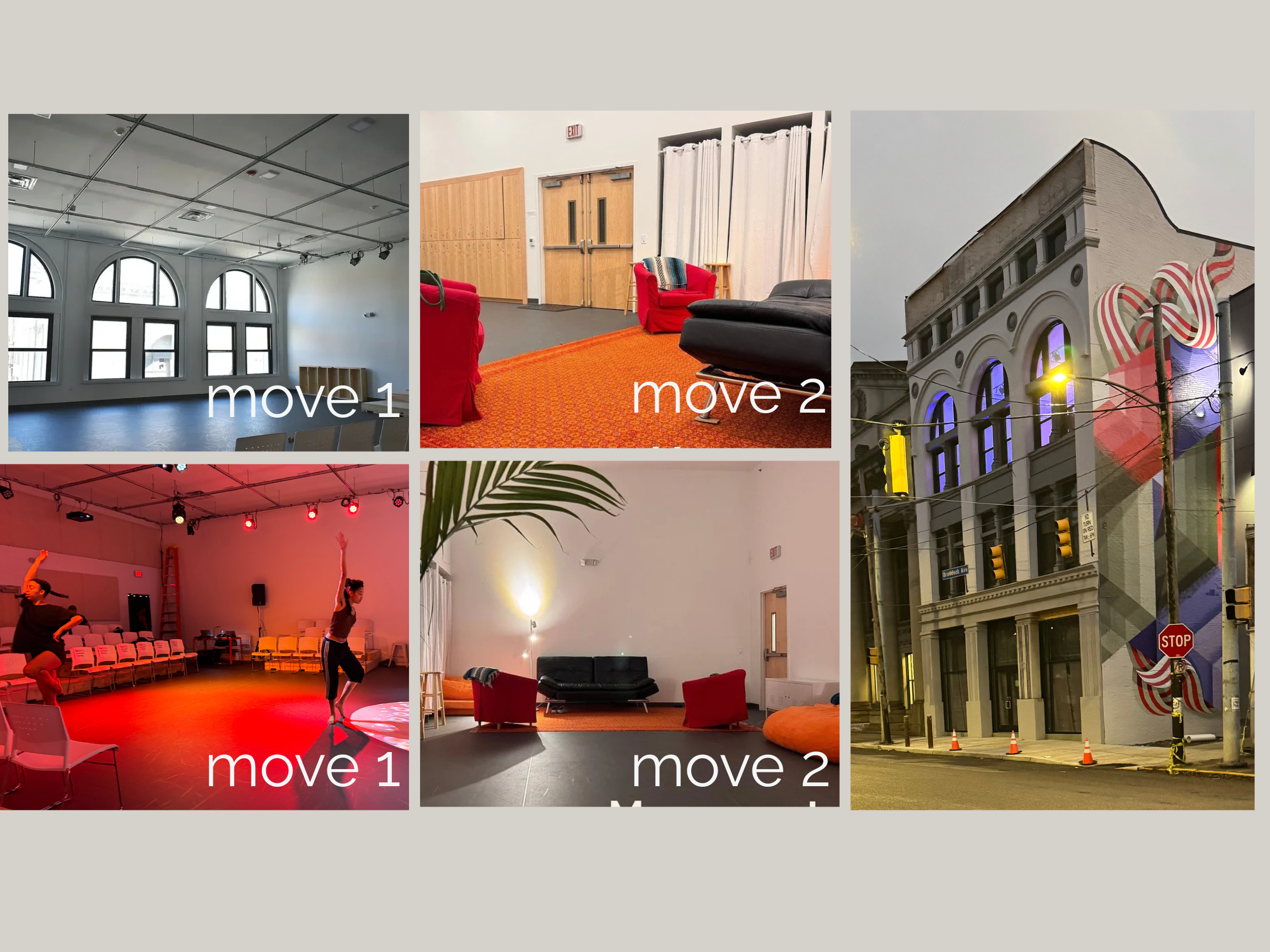Movement 2: Perfect for solo or duo rehearsals, meetings, or intimate gatherings, this 590 sq. ft. studio provides a private and focused space for creative work. With a comfortable layout and natural light, it’s ideal for small-scale movement practices, artist collaborations, or brainstorming sessions. Capacity: 15 people
